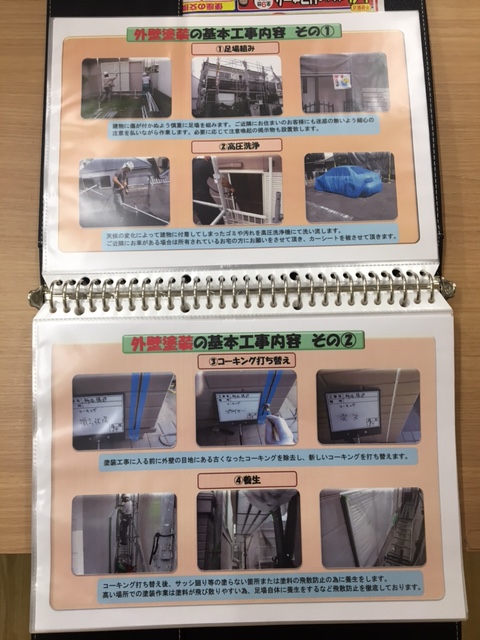 ↓外壁塗装の基本の工事内容を冊子でご案内しています。