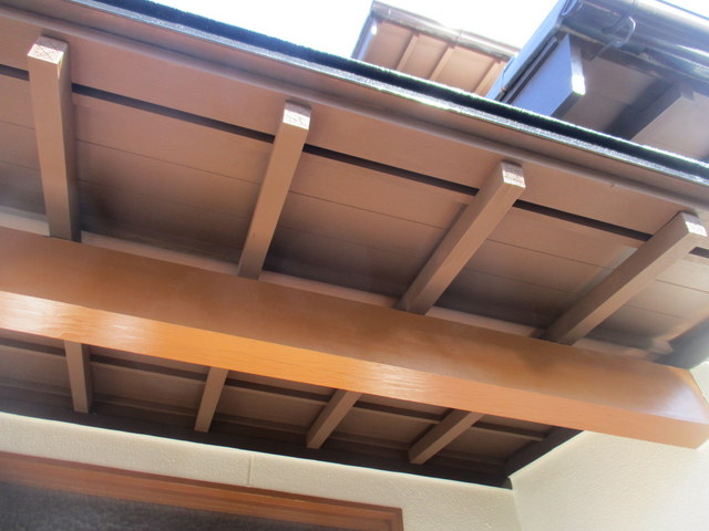 今回も木の軒天材や木部の色あせが著しく、浸透系塗料で塗っても濃い色でしか施工ができず色ムラも起きる可能性がありましので塗り潰し塗装をご提案しました。