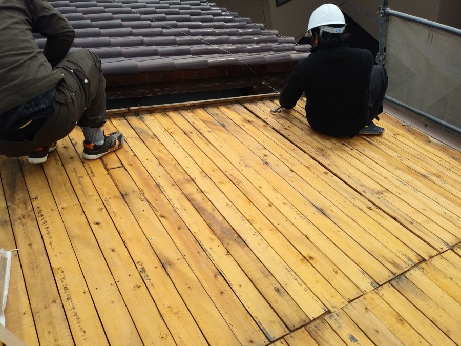 屋根瓦を撤去し、野地板の状態を確認します。