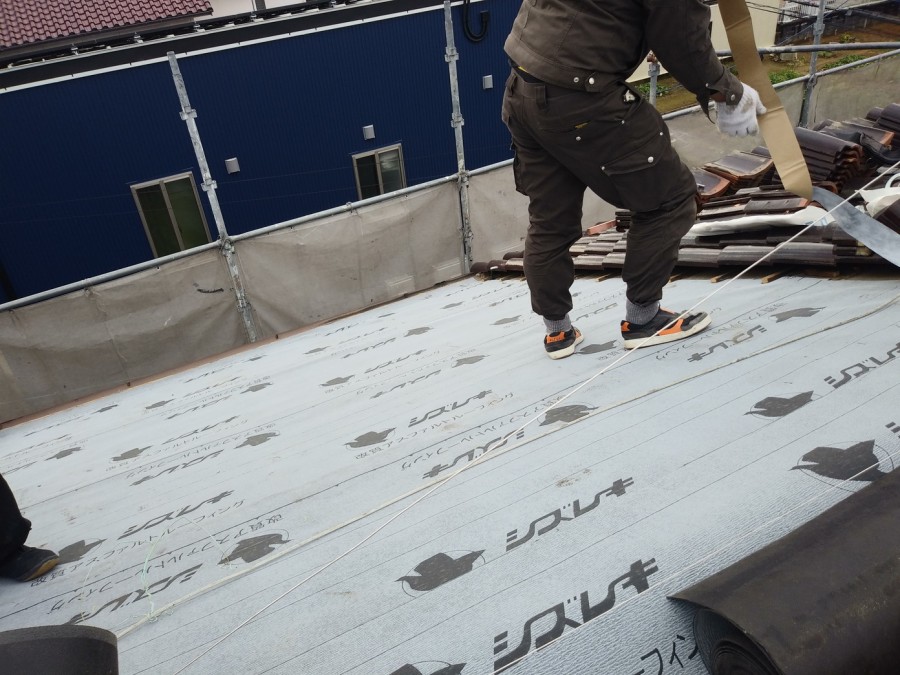 野地板の上にアスファルトルーフィングを施工します。
