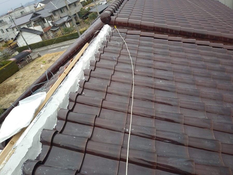 一度撤去した既存の瓦を設置し、棟部分の漆喰を施工します。