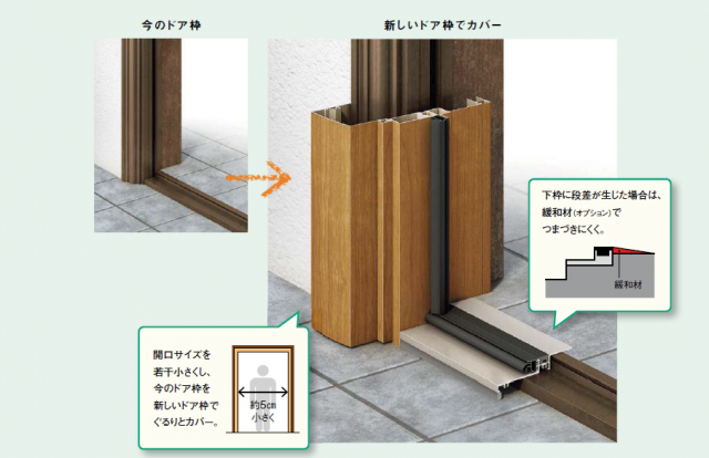 カバー工法とは既存のドア枠の上から新しい枠を取り付ける方法です。