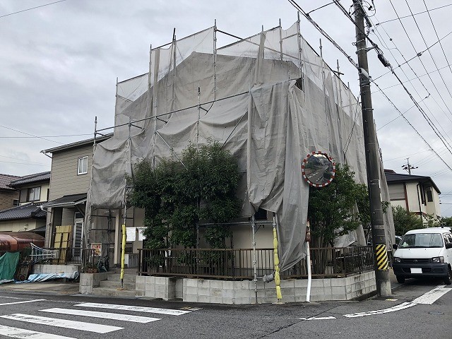 足場の周りには塗料が近隣のお家に飛び散ったりしないように