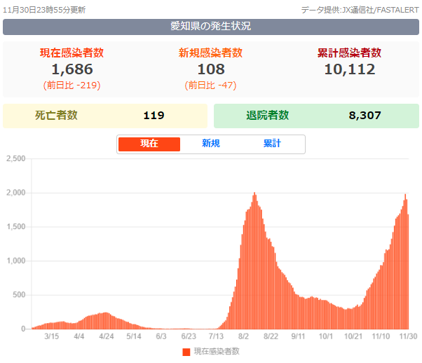 愛知県の発生状況を見たところ、第一波と言われていた3~4月頃と比べて
