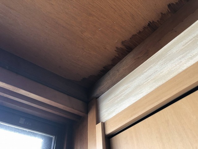 天井からの雨漏りが移動してサッシ廻りからも雨染みが発生していました