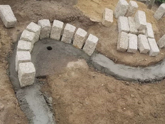 写真のように御影石を敷き詰めていけるように土を掘って形を作っていきます。