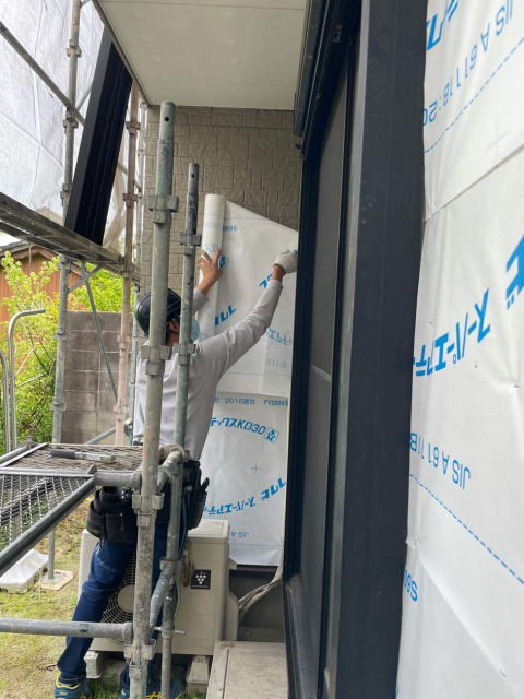 外壁からの雨漏りを防止するために防水紙を貼り付けていきます。