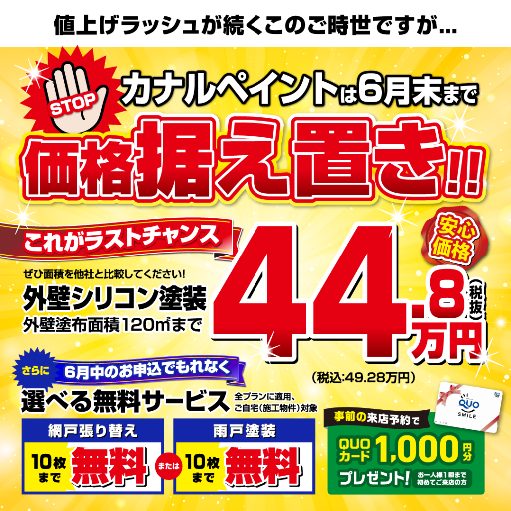 カナルペイントは、6月末まで、ずっと据え置き価格で商品の受付を実施させていただきます!