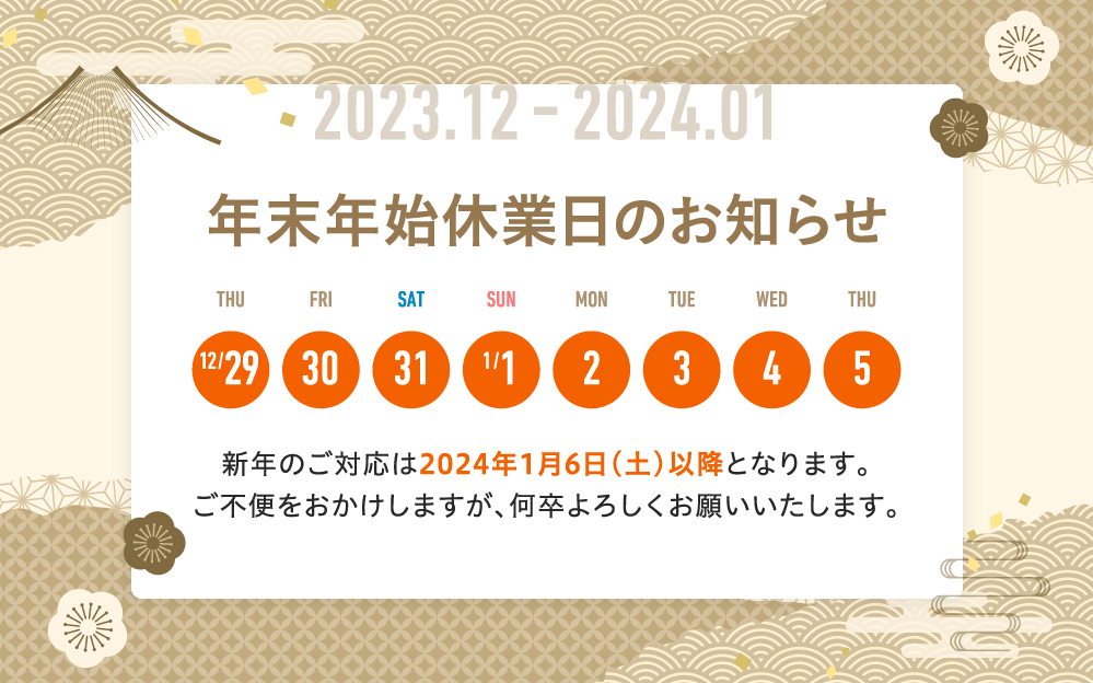 休業期間:12月29日(金)~2024年1月5日(金)