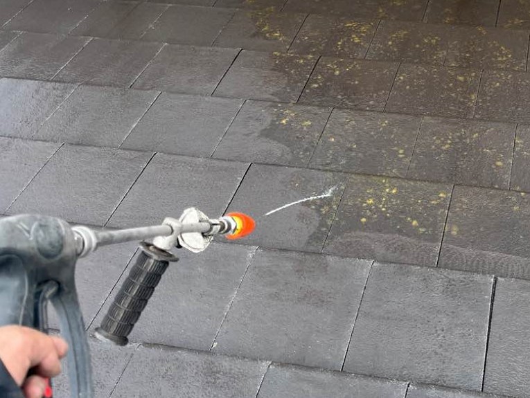 高圧洗浄を行い、屋根の表面についた汚れを取ります。