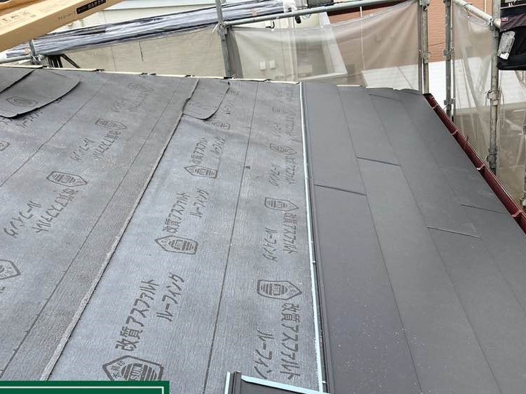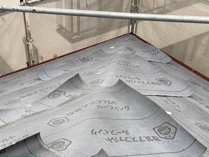既存の屋根の上からアスファルトルーフィングという防水のシートを張り付けます。