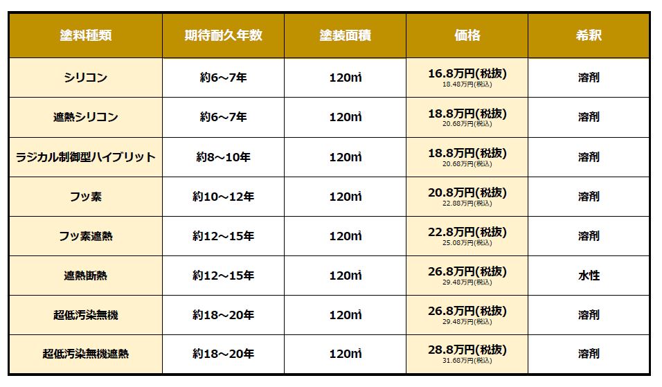 一般的には、シリコン塗料、フッ素塗料、無機塗料の順に高価です。