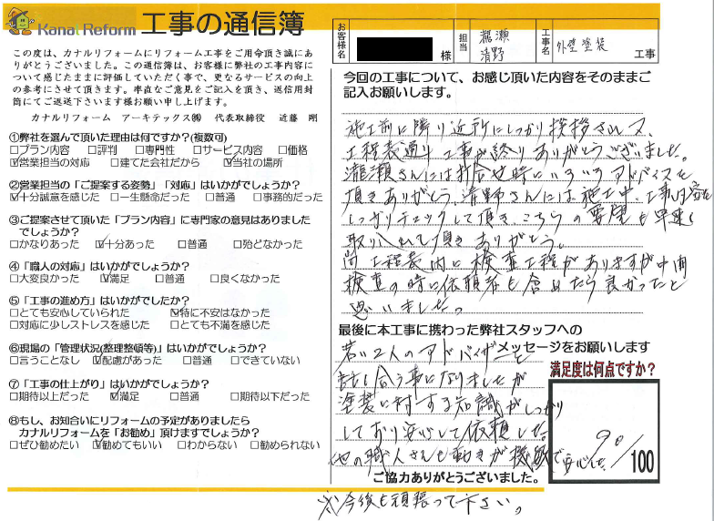 施工前に隣近所にしっかり挨拶され又、工程表通りに工事が終りありがとうございました。