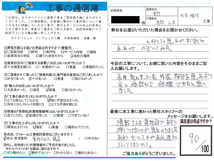 今回の工事について、お感じ頂いたことをそのままご記入お願い致します。