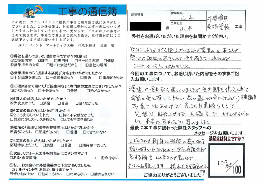 どこにしようかすごく悩んでいましたが営業の山本さんが熱心に相談に乗ってくれていろいろ考えてくれたのでここでやろうと決めました。