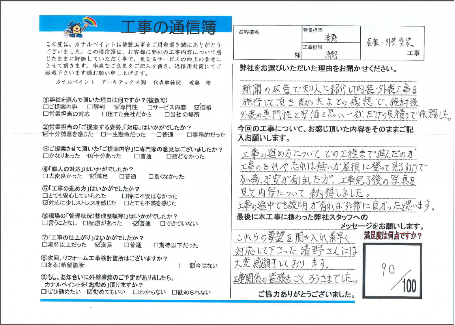 新聞の広告で知人に紹介して、内装・外装工事を施工して頂き良かったよとの感想で、検討後外装の専門性と安価と思い一社だけの見積で依頼した。