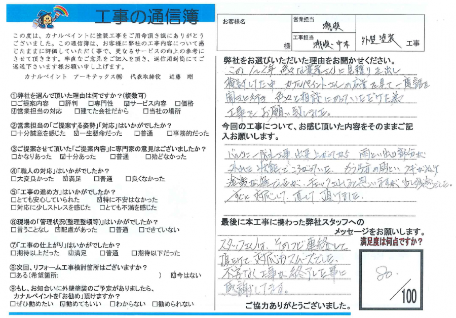 この1~2年色々な業者さんに見積りを出し検討した中カナルペイントさんの広告を見て一度話を聞きに行き色々と相談に乗っていただけた為工事をお願い致しました。