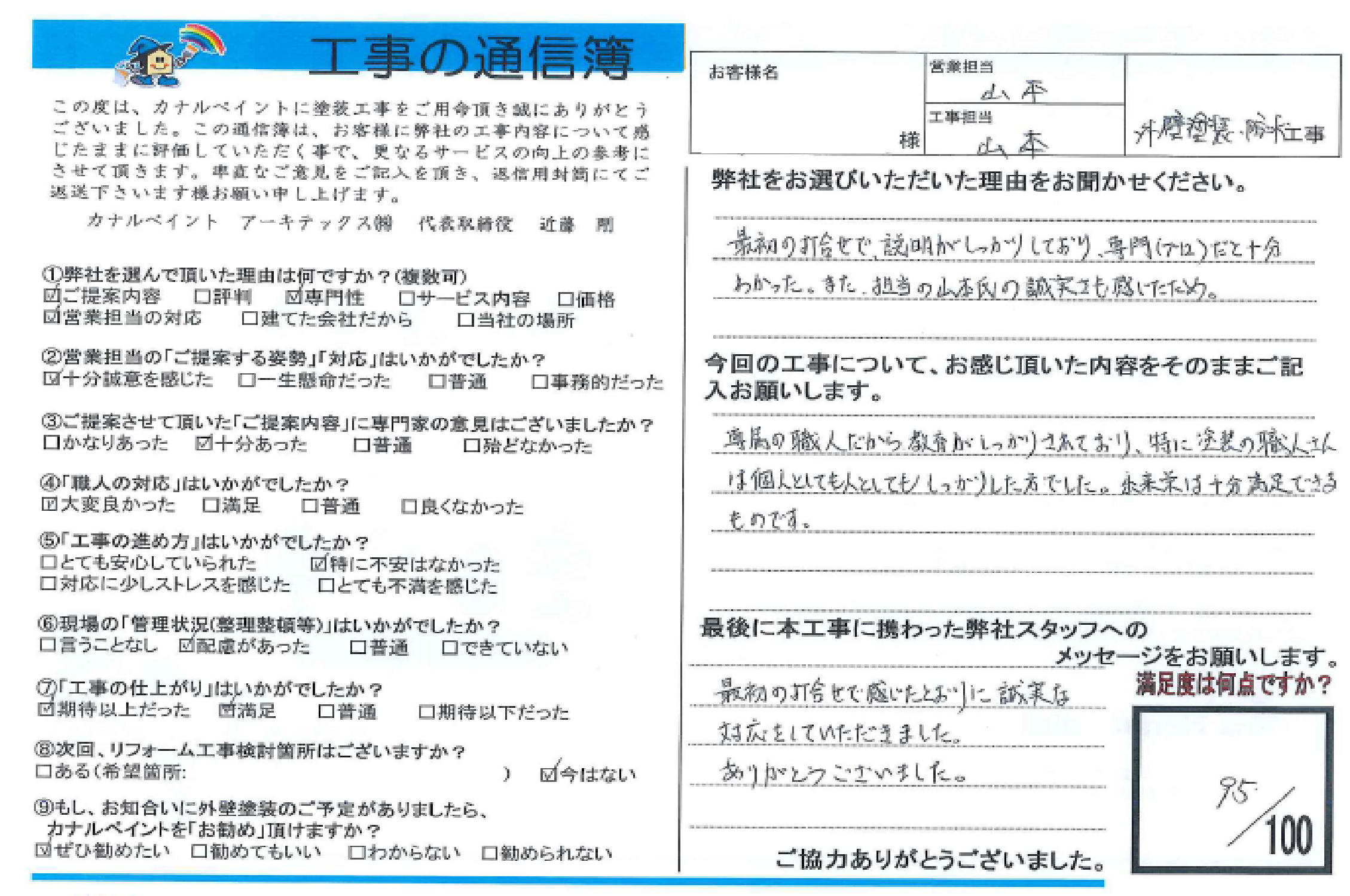 最初の打合わせで、説明がしっかりしており、専門(プロ)だと十分わかった。また、担当の山本氏の誠実さも感じたため。