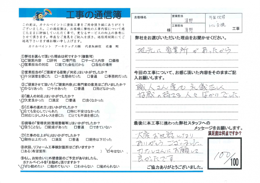 今回の工事について、お感じいただいた内容をそのままご記入ください。