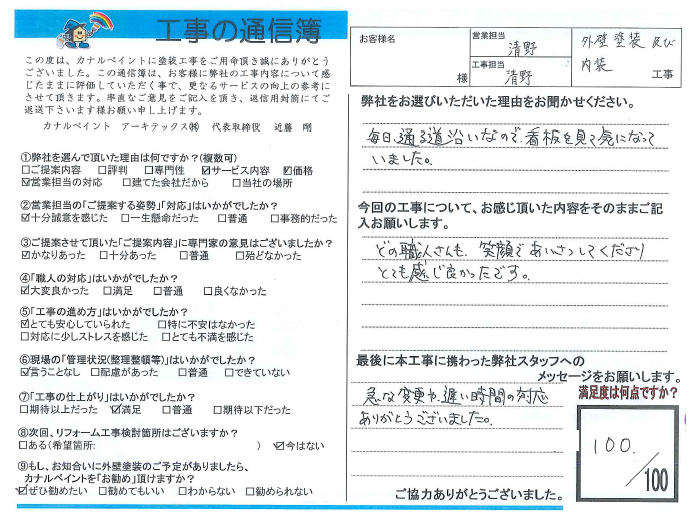 今回の工事について、お感じ頂いた内容をそのままご記入お願いします。