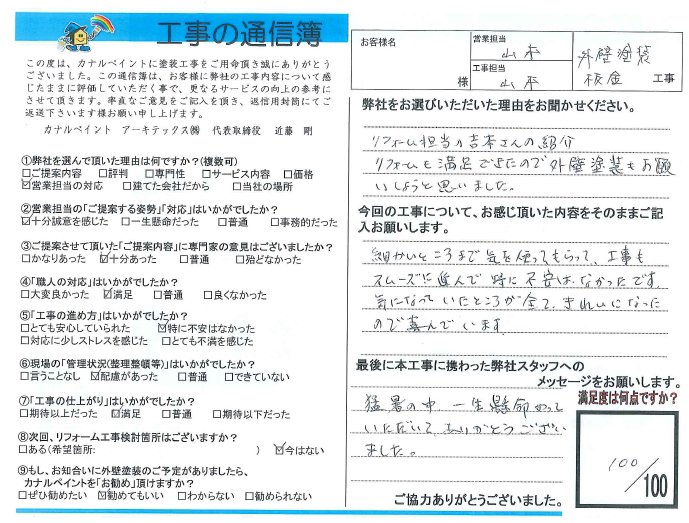 今回の工事について、お感じ頂いた内容をそのままご記入お願いします。