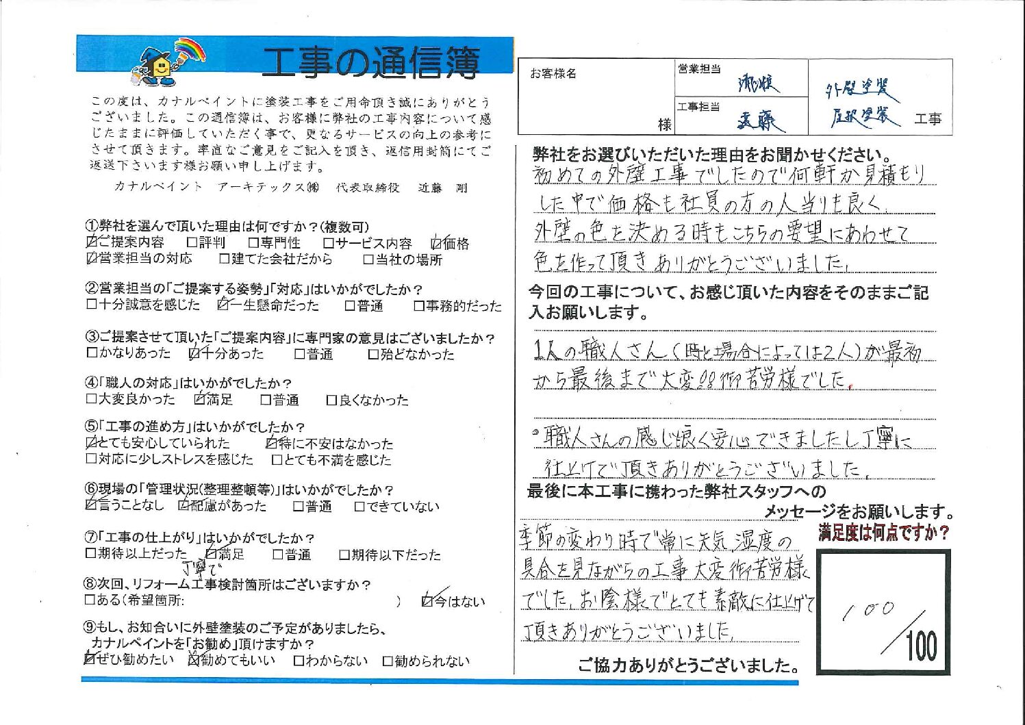 初めての外壁工事でしたので何軒か見積もりした中で価格も社員の方の人当りも良く、外壁の色を決める時もこちらの要望にあわせて色を作って頂きありがとうございました。