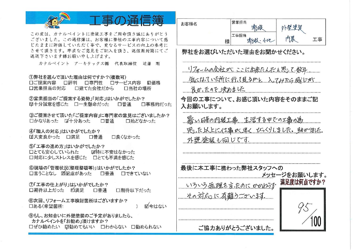 今回の工事について、お感じ頂いた内容をそのままご記入お願いします。