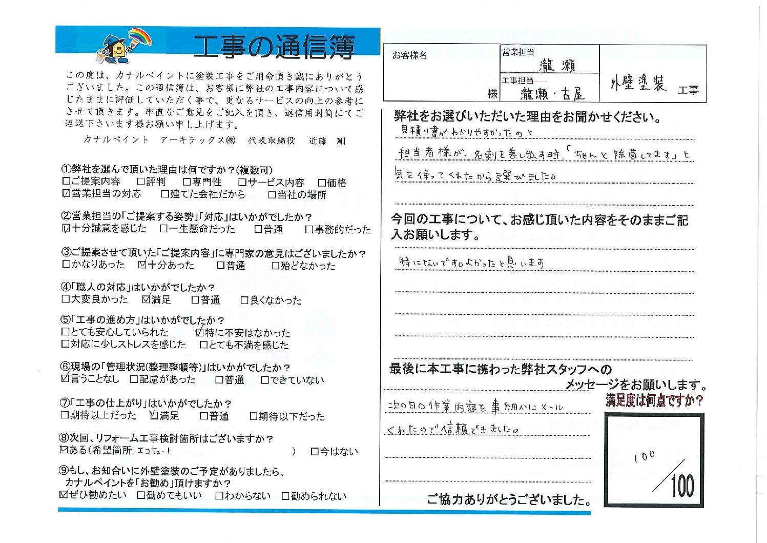 今回の工事について、お感じ頂いた内容をそのままご記入お願いします。