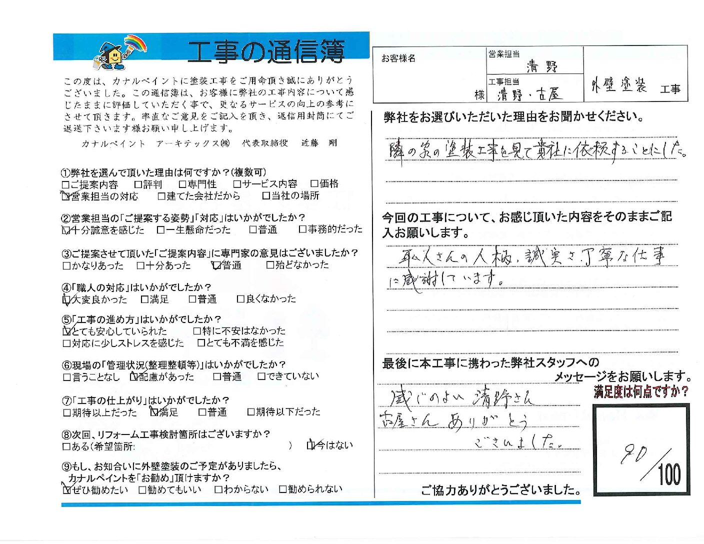 隣の家の塗装工事を見て貴社に依頼することにした。