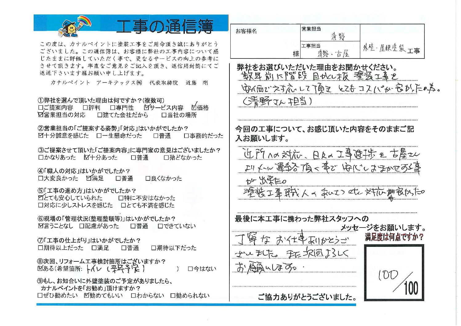 数年前に階段目かくし板塗装工事を安価で対応して頂き、とてもコスパが良かった為(清野さん担当)