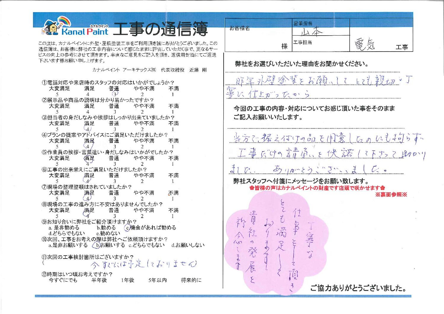 今回の工事の内容・対応についてお感じ頂いた事をそのままご記入お願いいたします。