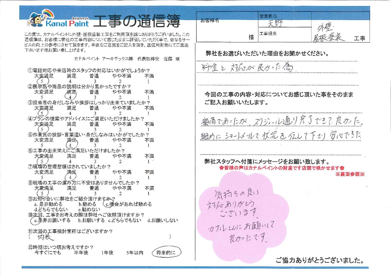 梅雨であったが、スケジュール通り完了できて良かった。こまめにショートメールで状況を伝えて下さり安心できた。