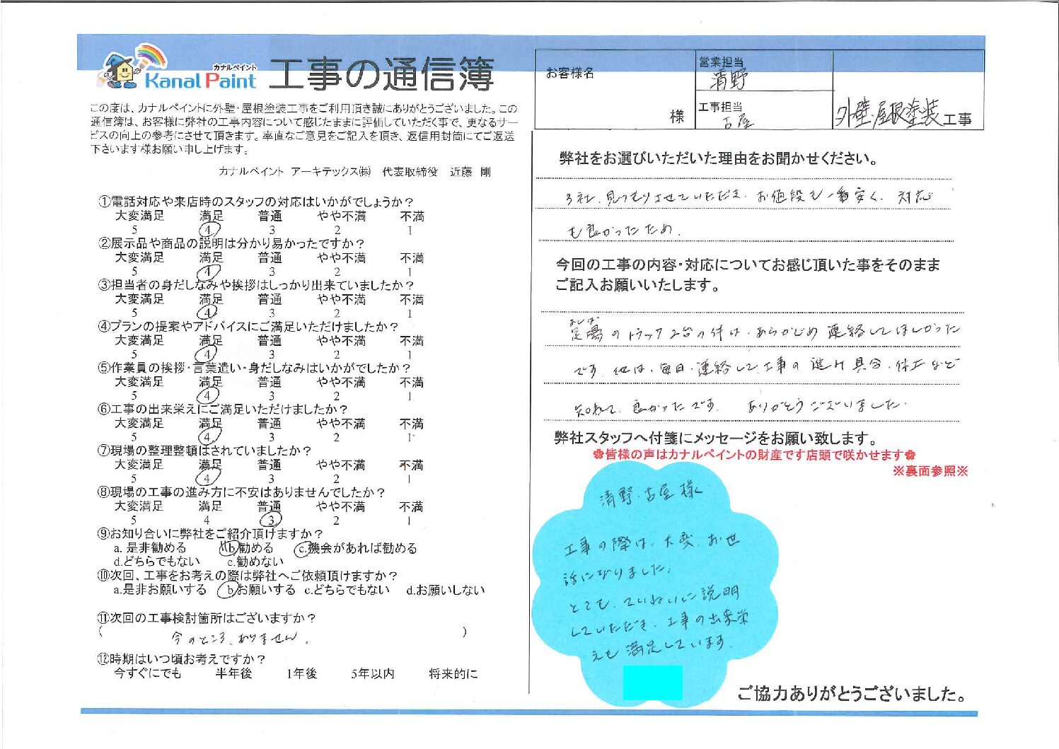 足場のトラック2台の件は、あらかじめ連絡してほしかったです。他は毎日連絡して工事の進み具合、仕上がりなど知れて良かったです。ありがとうございました。