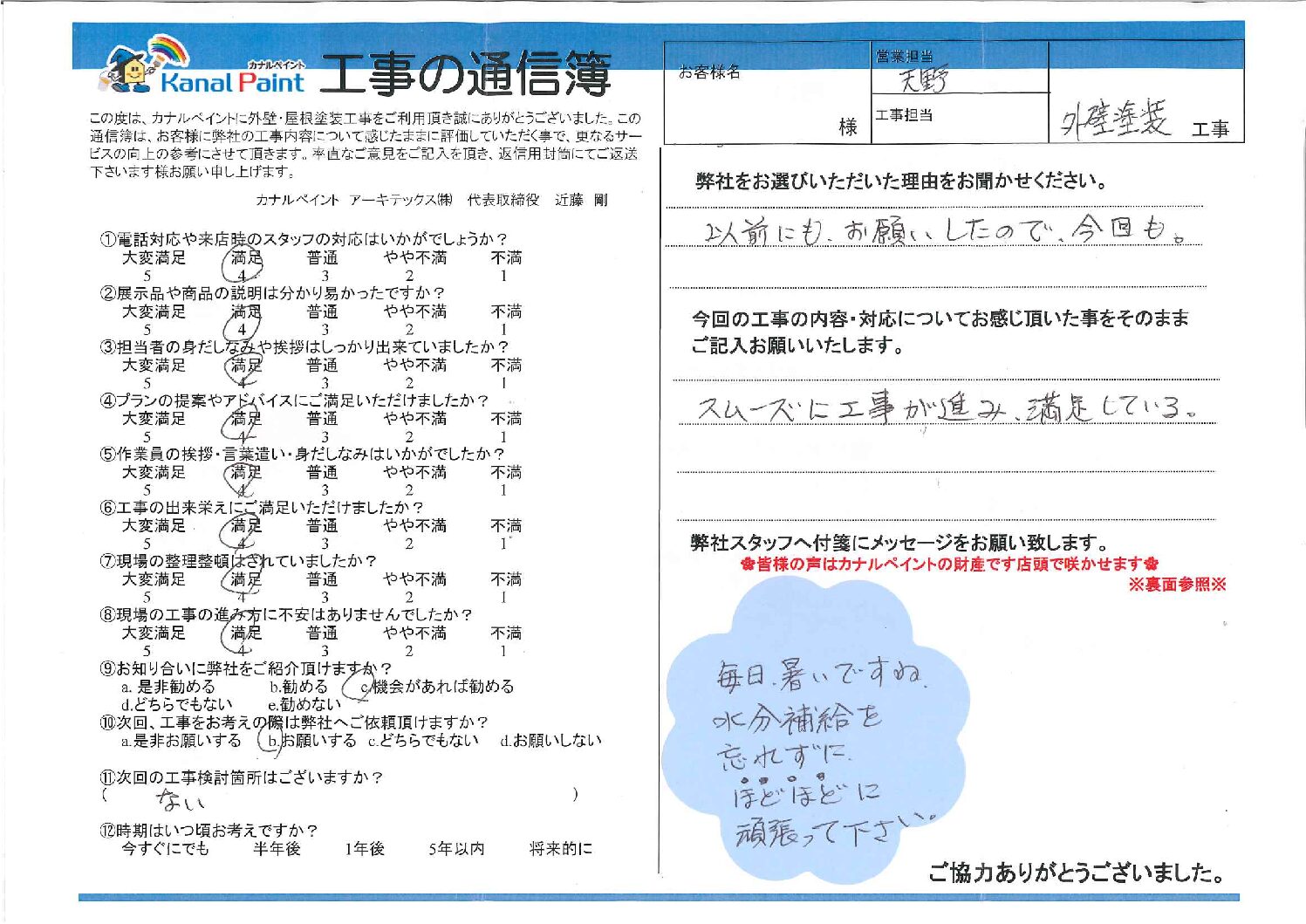 今回の工事の内容・対応についてお感じ頂いた事をそのままご記入お願いいたします。