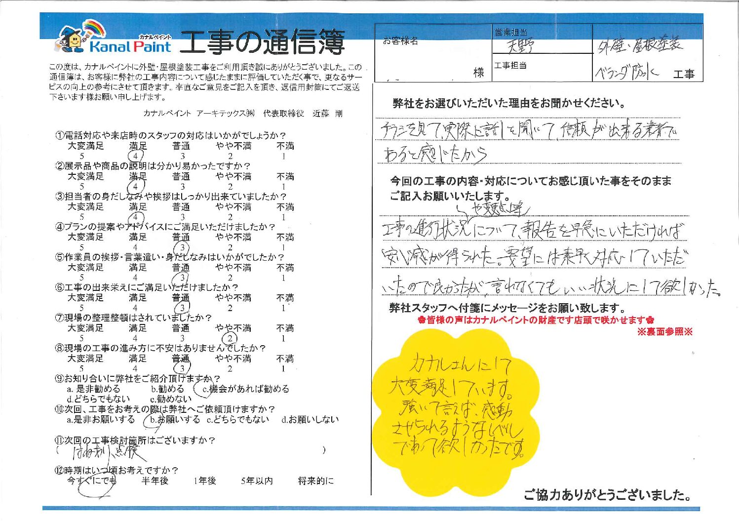 今回の工事の内容・対応についてお感じ頂いた事をそのままご記入お願いいたします。