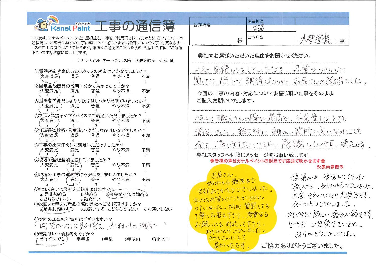 何より職人さんの腕が最高で、外装塗りはとても満足しました。終了後に細かい箇所で気になったことも全て丁寧に対応してもらい感謝しています。満足です。