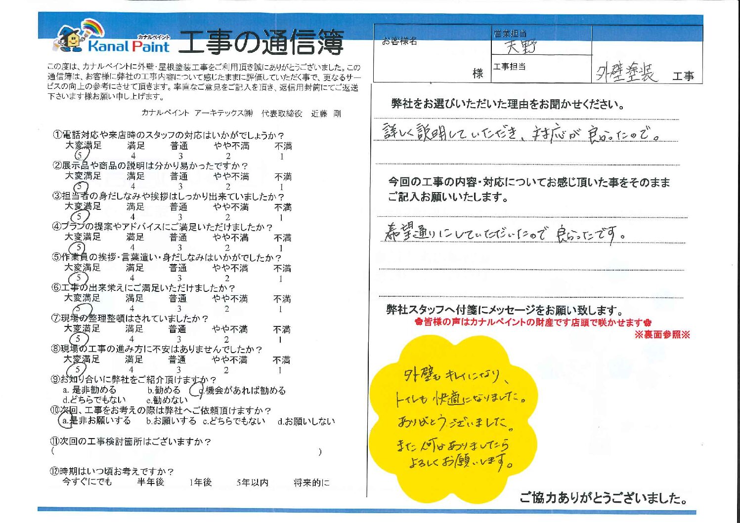 外壁もキレイになり、トイレも快適になりました。ありがとうございました。また何かありましたら、よろしくお願いします。