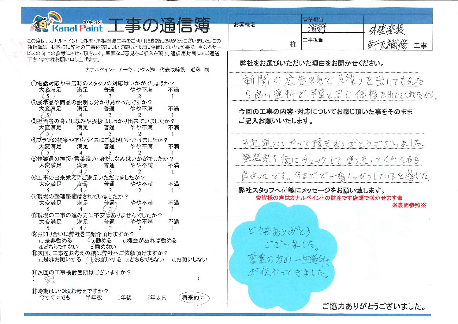 新聞の広告を見て、見積りを出してもらったら良い塗料で予算と同じ価格を出してくれたから