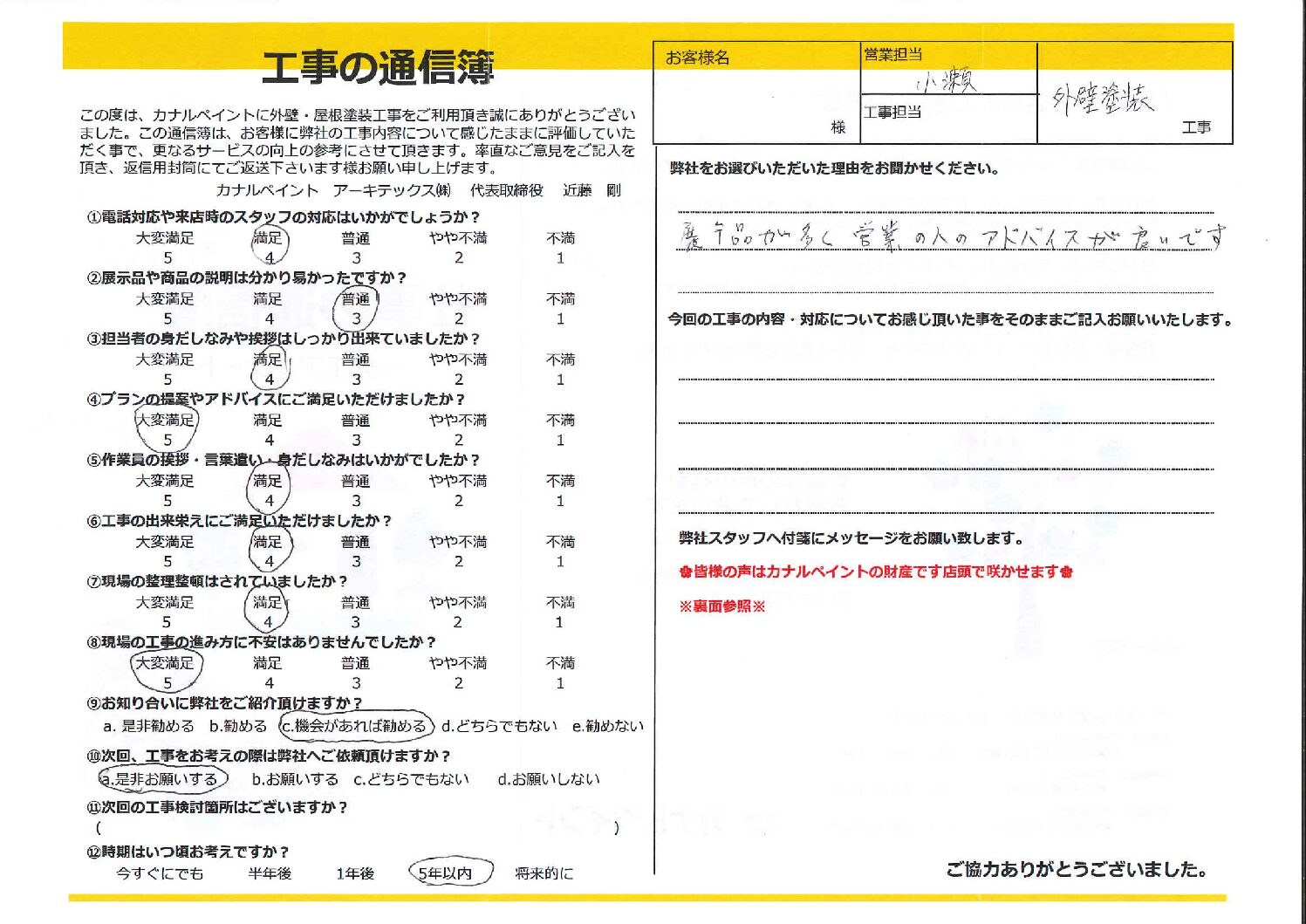 今回の工事の内容・対応についてお感じ頂いた事をそのままご記入お願いいたします。