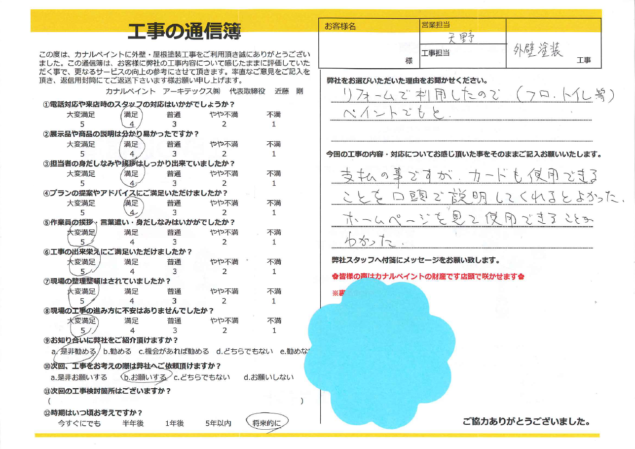 今回の工事の内容・対応についてお感じ頂いた事をそのままご記入お願いいたします。