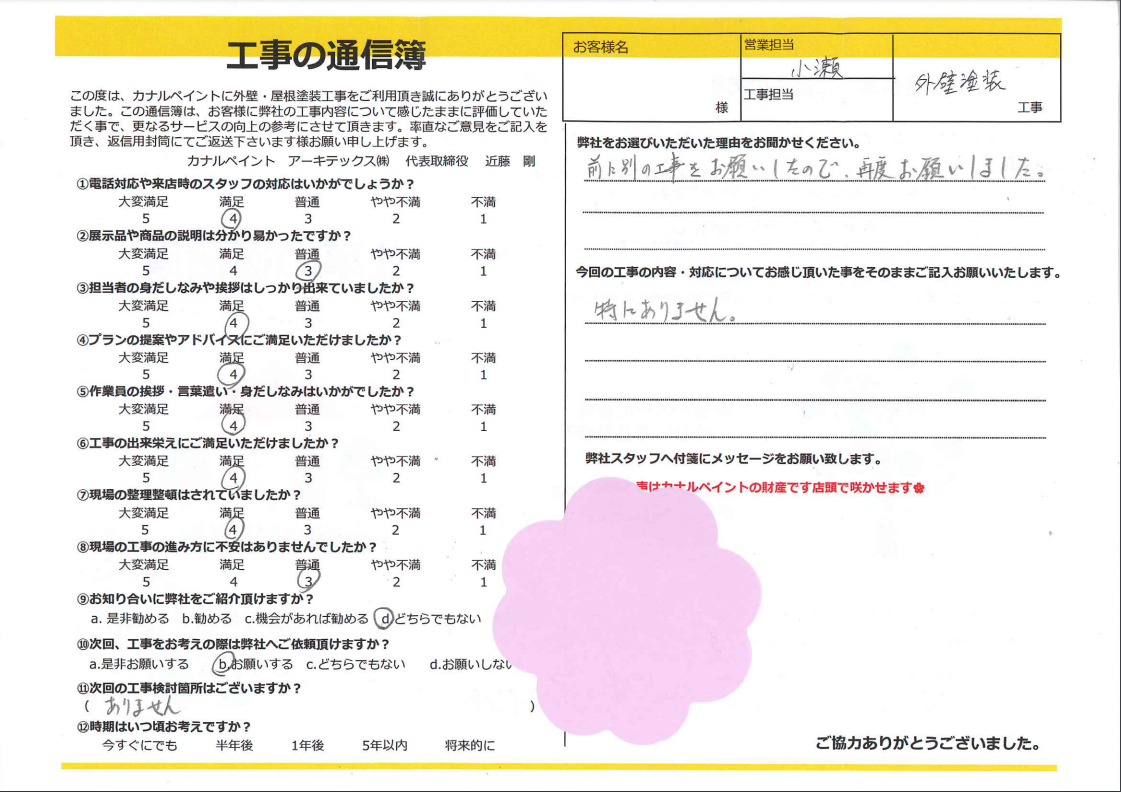 今回の工事の内容・対応についてお感じ頂いた事をそのままご記入お願いいたします。