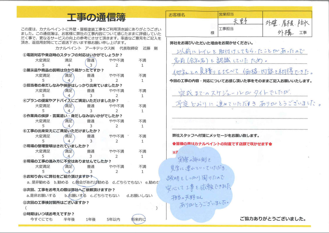 実際の施工例を見学に連れて行っていただき、説明をしっかり聞けたので安心して工事を依頼できました。担当の天野さんありがとうございました。