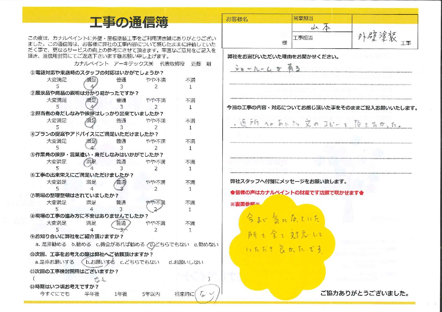 今回の工事の内容・対応についてお感じ頂いた事をそのままご記入お願いいたします。