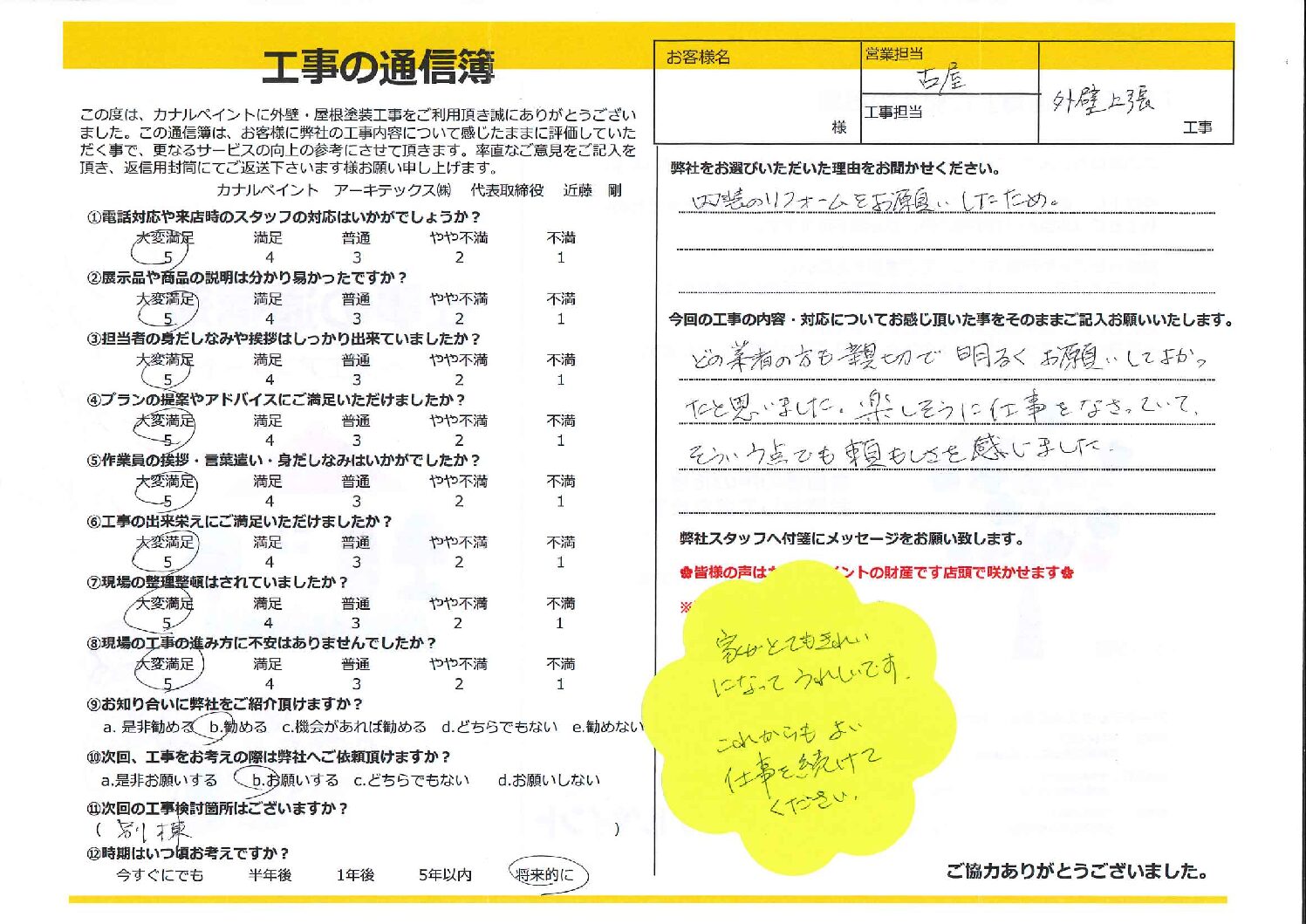 家がとてもきれいになってうれしいです。これからもよい仕事を続けてください。