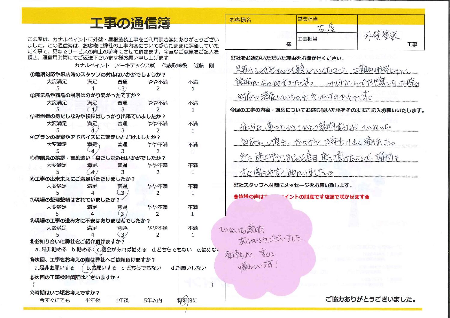 分からない事にもひとつひとつ説明するなど、ていねいな対応をして頂き、おかげで不安も小さく済みました。また、施工中もほとんど連日来て頂けたことで、疑問もすぐ聞きやすく助かりました。