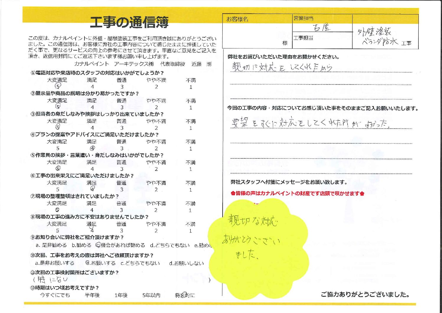 今回の工事の内容・対応についてお感じ頂いた事をそのままご記入お願いいたします。