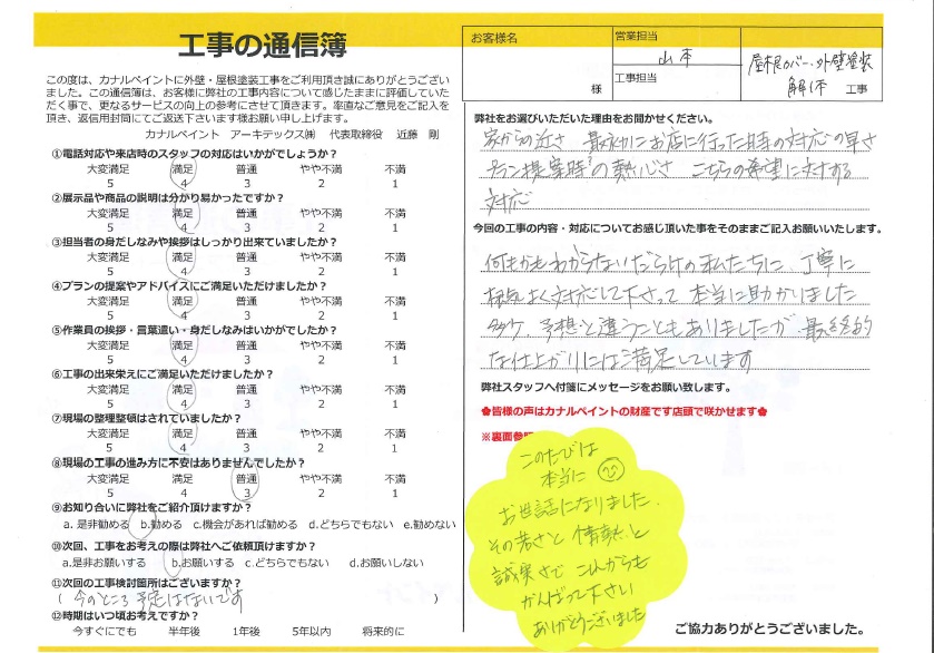 お客様より工事に携わったスタッフへのメッセージ