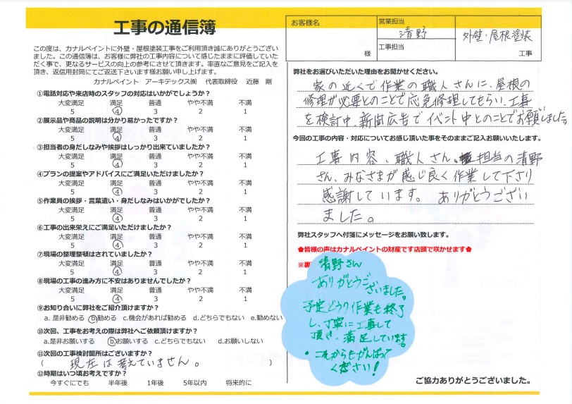 予定どうり作業も終了し、丁寧に工事して頂き、満足しています。