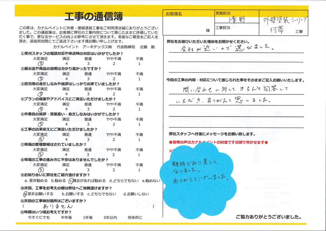 お客様より工事に関わったスタッフへのメッセージ