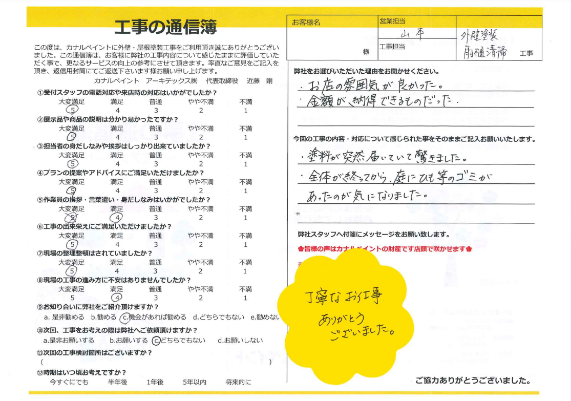 全体が終わってから、庭にひも等のゴミがあったのが気になりました。